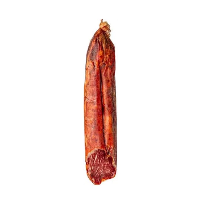 Embutido fino y aromático, elaborado con carne de cerdo ibérico de bellota. Destaca por su textura suave y su sabor equilibrado, con especias moderadas.